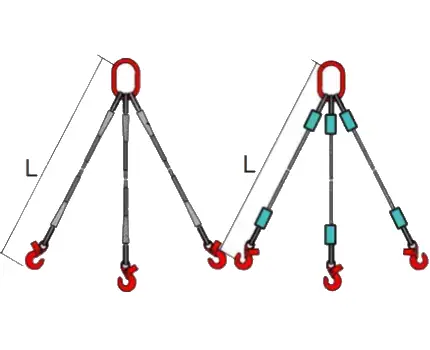 Состоит из 3-х канатных ветвей, верхней концевой элемент - звено соответствующей грузоподъемности. Ниже концевые элементы - крюки, скобы, захваты. Строп в основном используется для перемещения грузов, имеющих 3 монтажных крепления.